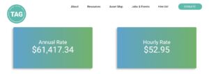 To further our analysis, we also referenced the Teaching Artists Guild’s TA Pay Rate Calculator which offers national insight on living wages for teaching artists across U.S. regions. The Calculator factors in information based on elements such as employment type, level of experience, and the size of the hiring organization. According to The Teaching Artist Guild’s Calculator the liveable hourly rate for a Teaching Artist working in Chicago as an independent contractor at a “professional” level, with 0 dependents, should be making an hourly rate of $52.95 and an annual rate of $61,417.  While these numbers do not account for all possible variables, it does provide us with a starting point and some expectations of where the rates land for TA pay.